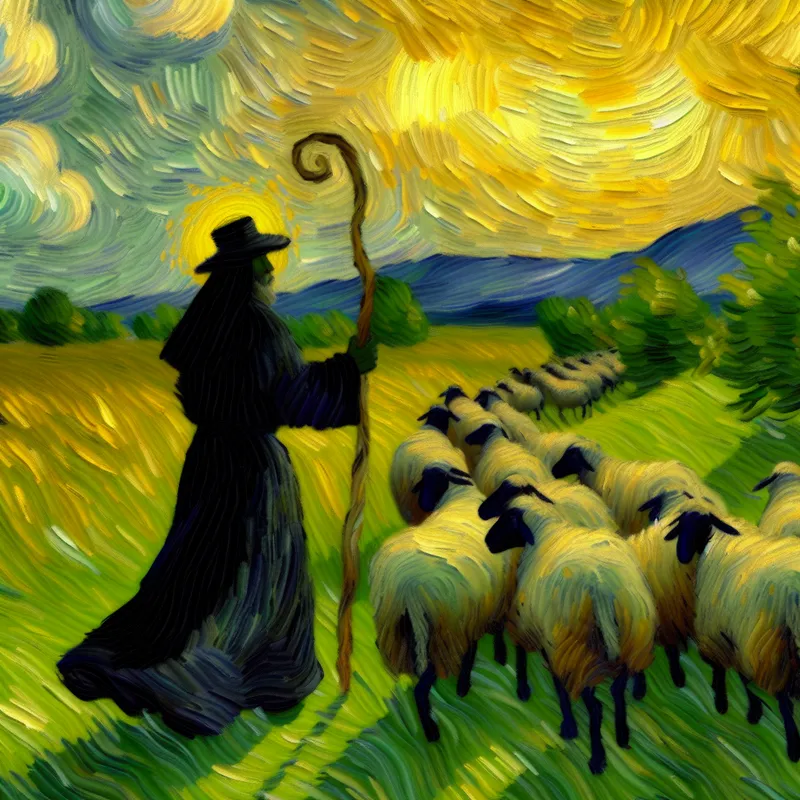 Herder in pastorale landschap in Van Gogh-stijl, symboliserend Gods bescherming en leiding als de Goede Herder in christelijk geloof
