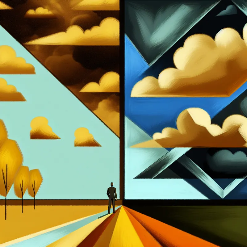Retro-futuristische illustratie van een persoon onder een gespleten hemel die de schijn van een vergelijking toont: links een warme, gouden lucht met zachte wolken en rechts een donkere, stormachtige lucht met geometrische wolken