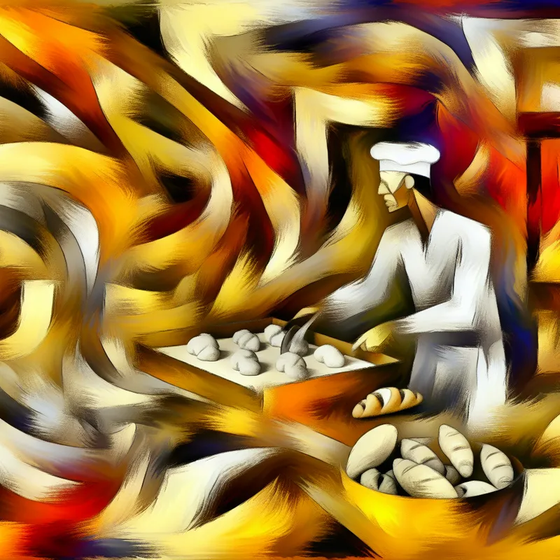 Abstract expressionistische voorstelling van een bakker die deeg kneedt, met warme kleuren en dynamische penseelstreken in de stijl van Willem de Kooning
