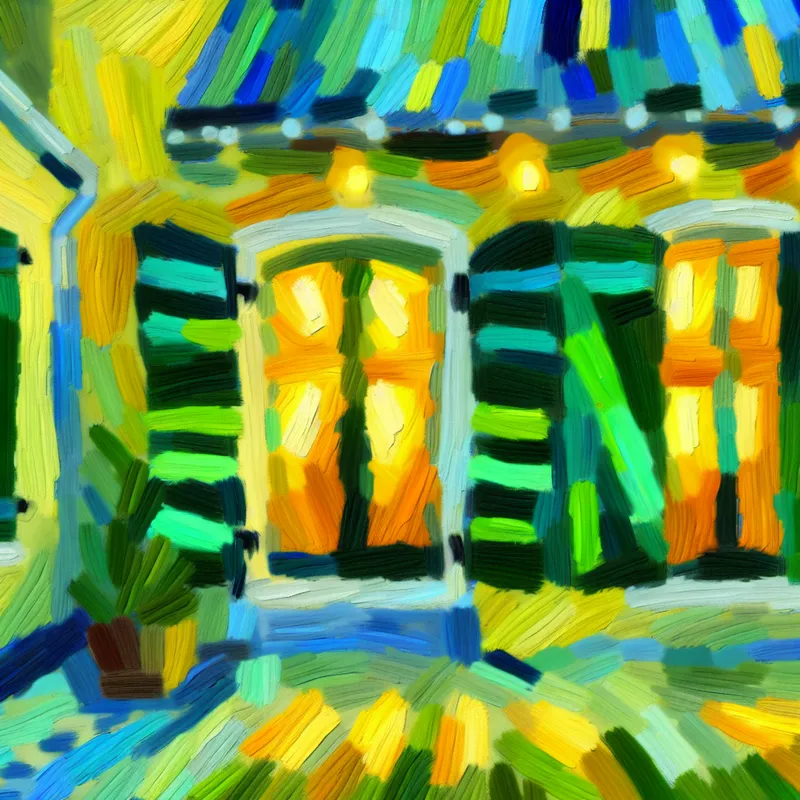 Abstract schilderij van een oud Nederlands huis met groene houten blinden voor de ramen, licht van binnen zichtbaar