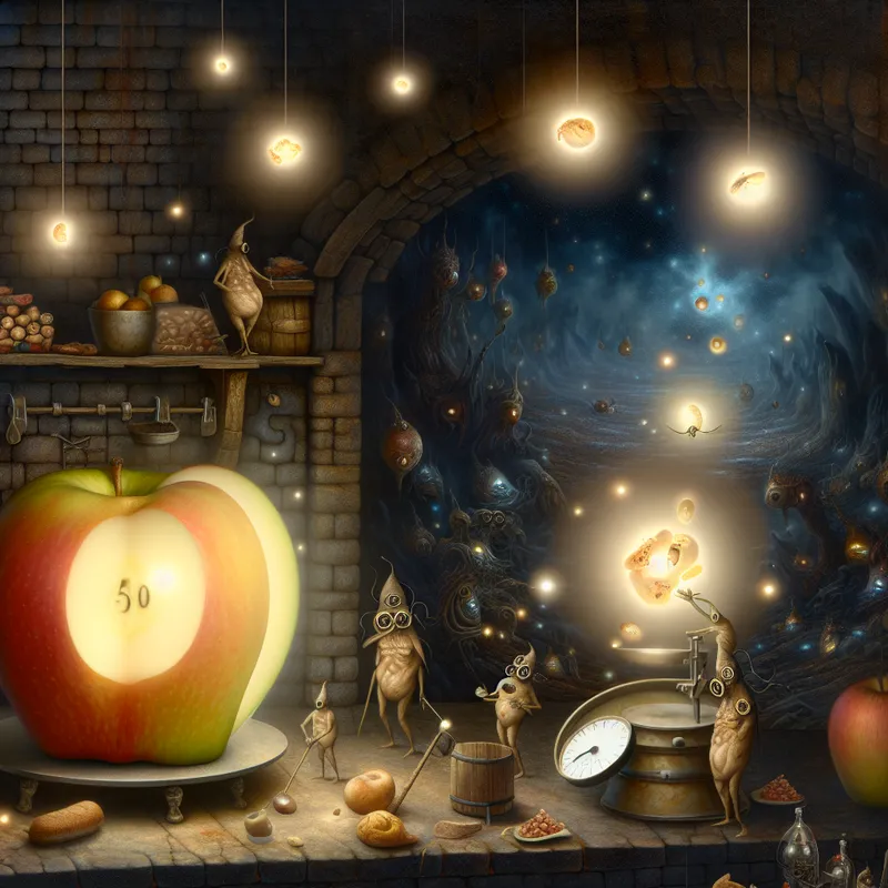 Surrealistisch tafereel van een magische keuken waar voedsel transformeert in gloeiende energie-orbs, met een stralende appel met het getal 50 in de kern als symbool voor calorieën