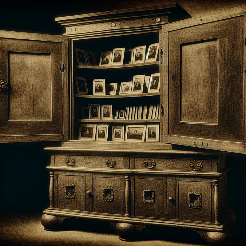 Gedetailleerde Rembrandt-stijl afbeelding van een open houten kast met oude foto's, verlicht door dramatisch chiaroscuro licht, symboliserend de binnenkant van herinneringen