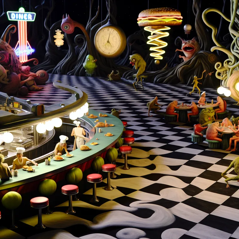 Surrealistisch Amerikaans eethuis geïnspireerd op Hieronymus Bosch met hybride wezens die gloeiende hamburgers eten in een dromerige diner-omgeving