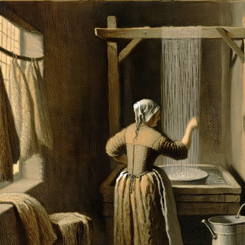 17e-eeuwse Nederlandse badkamer scène met persoon die zich wast onder stromend water uit een historische sproeier