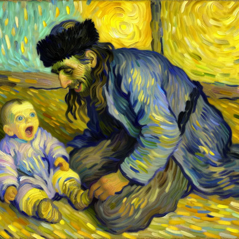 Teder moment van een baby die zijn eerste woordjes zegt, omringd door een warme, Van Gogh-achtige sfeer met zwierige penseelstreken en een vrolijke volwassene die erbij aanwezig is