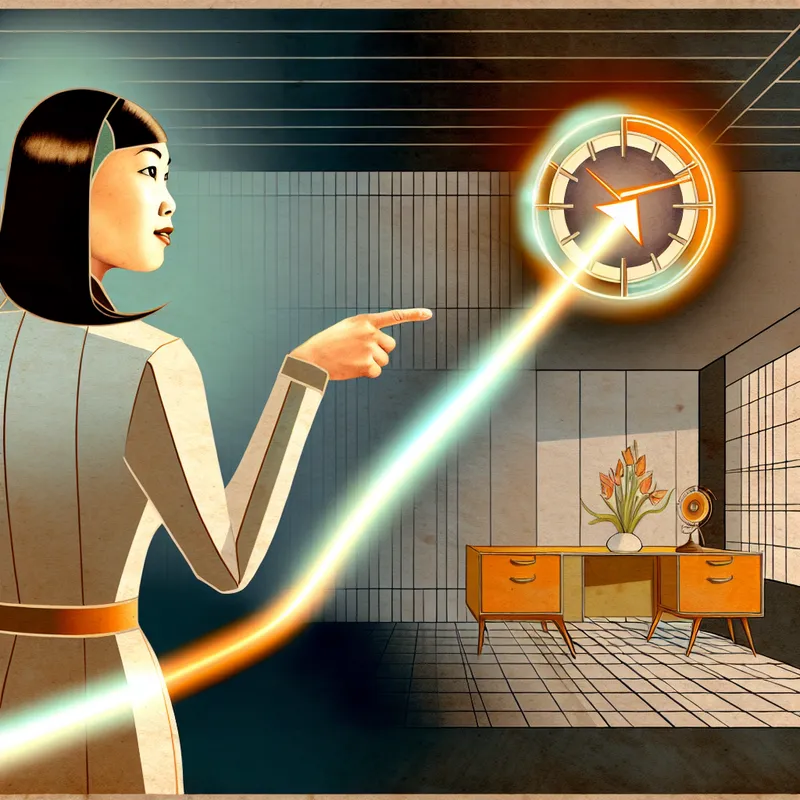 Illustratie van een persoon die met een gloeiende pijl terugverwijst naar een klok in een retro-futuristisch kantoor, symboliserend een verwijzing naar een eerder besproken onderwerp