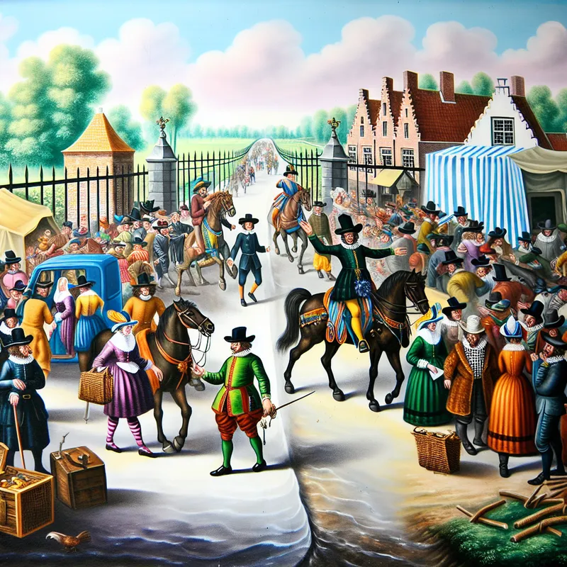 Historische grensovergang tussen Nederland en België met reizigers te voet, te paard en in koetsen, douanebeambten en een grensmarkering in de stijl van Frans Hals