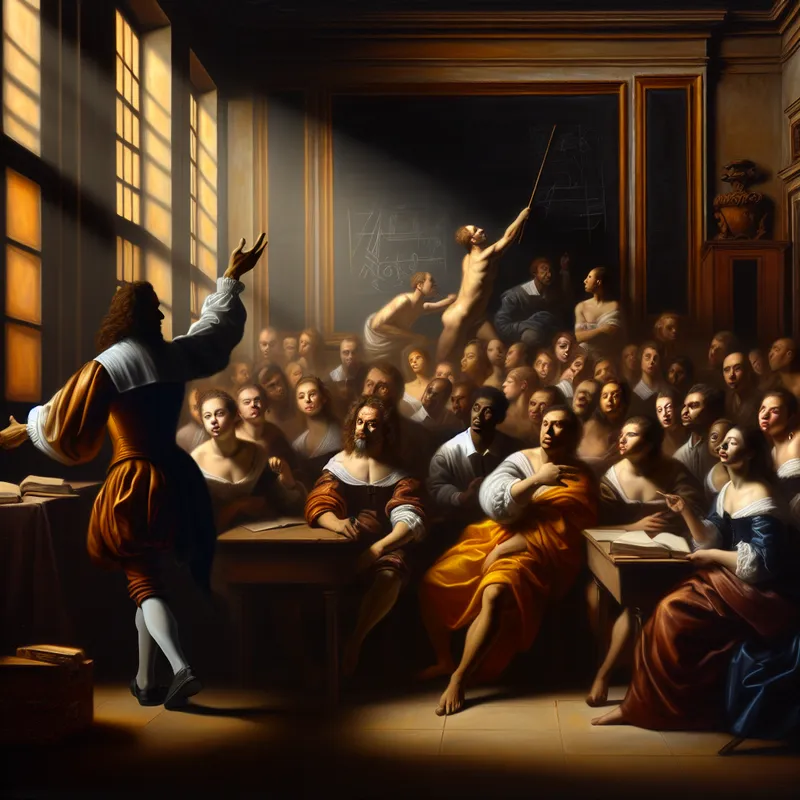 Barokke klaslokaalscène met een enthousiaste leraar die lesgeeft aan een groep geëngageerde studenten in een dynamische en levendige omgeving