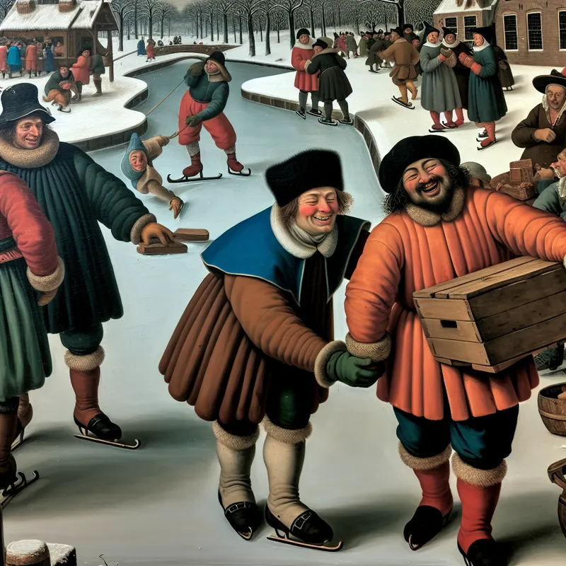Twee mannen in 17e-eeuwse Nederlandse winterkleding helpen elkaar op een drukbezocht bevroren kanaal, symbool voor vriendschap en kameraadschap