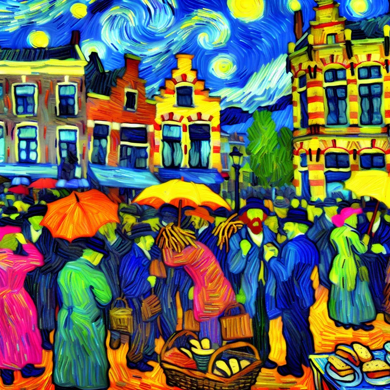 Drukke Nederlandse marktstraat in Van Gogh-stijl met wervelende penseelstreken en anonieme mensen onder bewolkte lucht