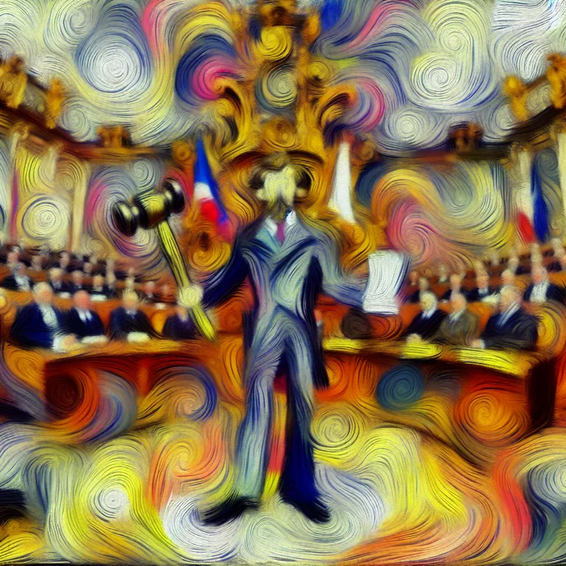Abstract expressionistische voorstelling van een minister in een parlement, symboliserend leiderschap en verantwoordelijkheid in de politiek