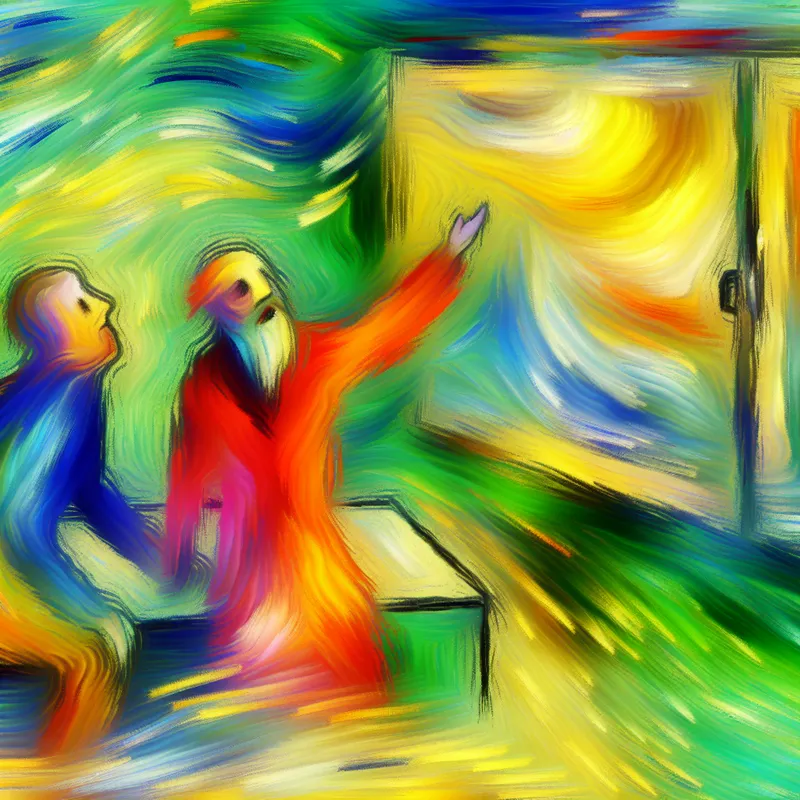 Abstract expressionistisch schilderij van twee figuren in gesprek, waarbij de ene bevestiging zoekt over het mooie weer met gebaren naar een zonnig raam