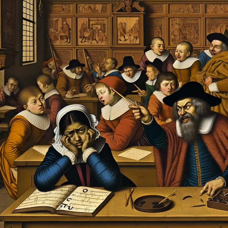 17e-eeuws Nederlands klaslokaal met een teleurgesteld meisje dat een onvoldoende 'O' voor Frans op haar schoolrapport ziet, terwijl de leraar streng wijst en klasgenoten gniffelen