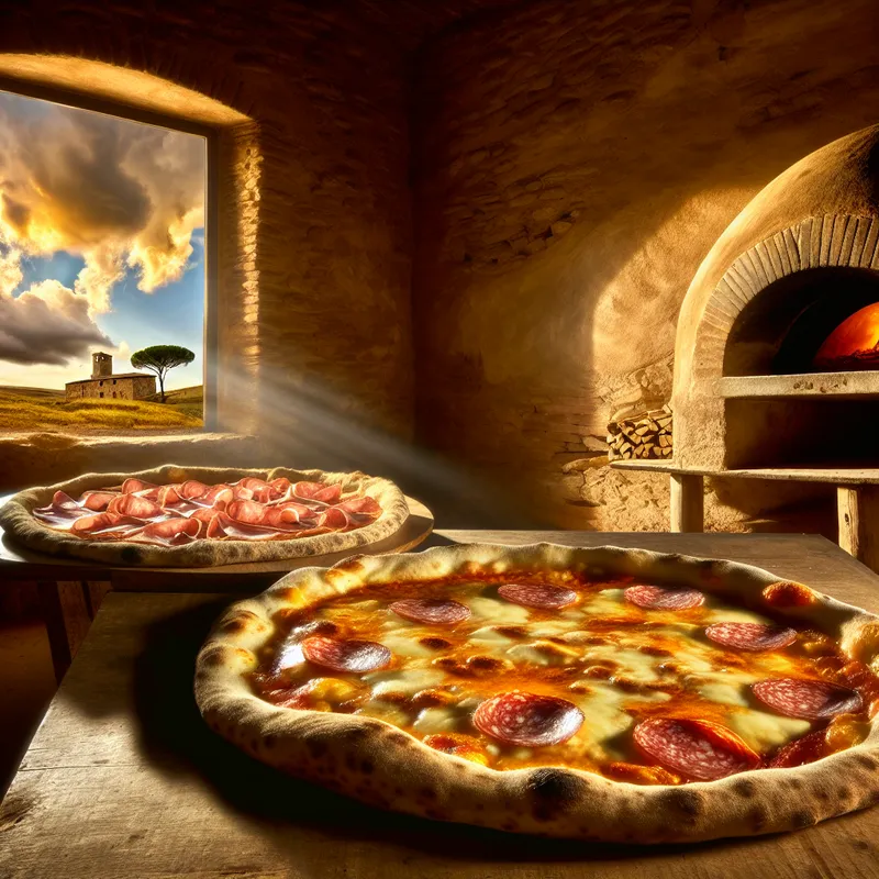 Versgebakken Italiaanse pizza met salami op houten tafel in rustieke keuken met traditionele steenoven en dramatische lucht