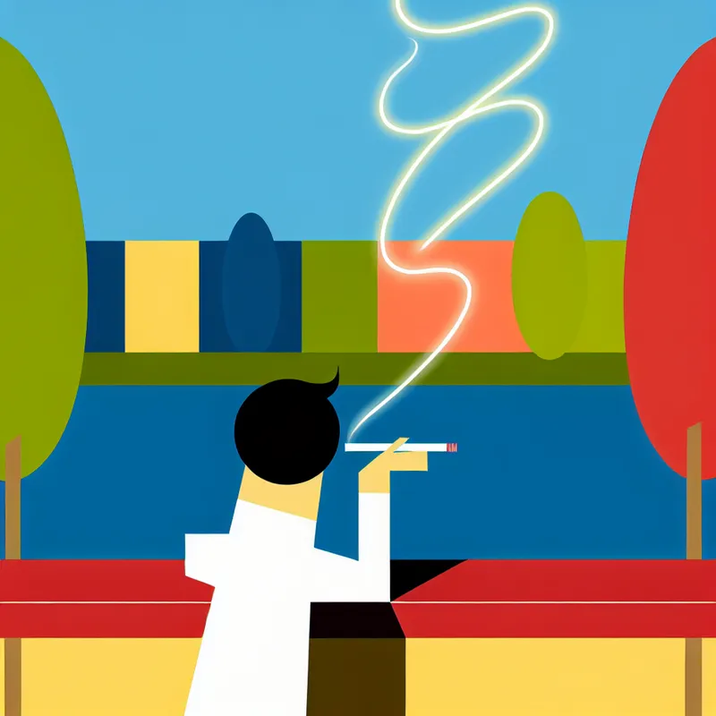 Minimalistische illustratie van een persoon die buiten een sigaret rookt tegen een muur, met opvallende rook en gloeiende sigaretpunt
