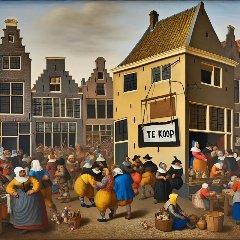 Levendige Nederlandse straatmarkt met een opvallend 'Te Koop' bord aan een hoekhuis in de stijl van Jan Steen