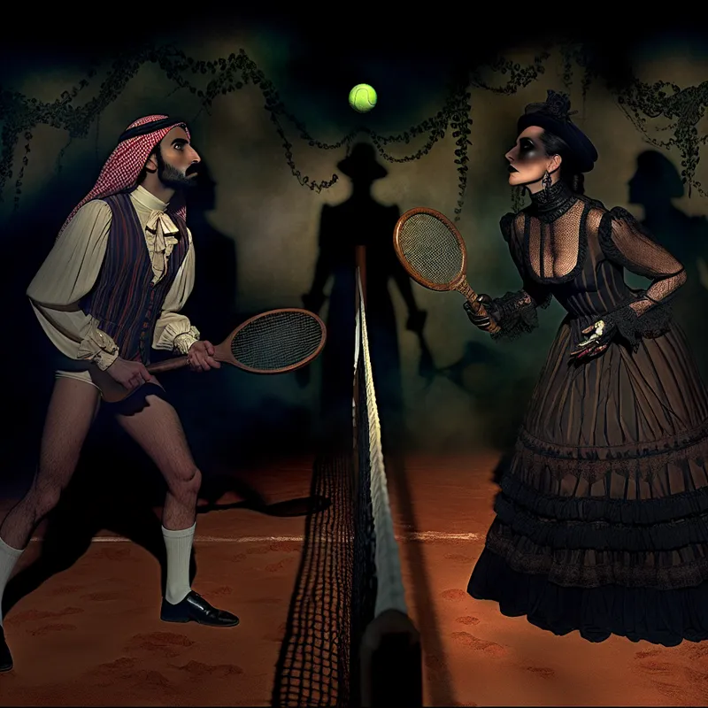 Donkere, symbolische tenniswedstrijd in Victoriaanse stijl met gotische details en mysterieuze sfeer, geïnspireerd door Félicien Rops