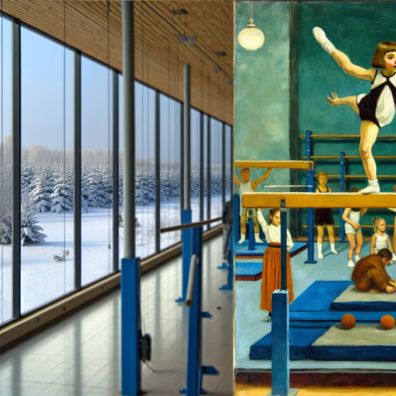 Jong meisje voert elegante gymnastiekroutine uit op de evenwichtsbalk in winterse sportzaal met kinderen die oefenen op verschillende toestellen
