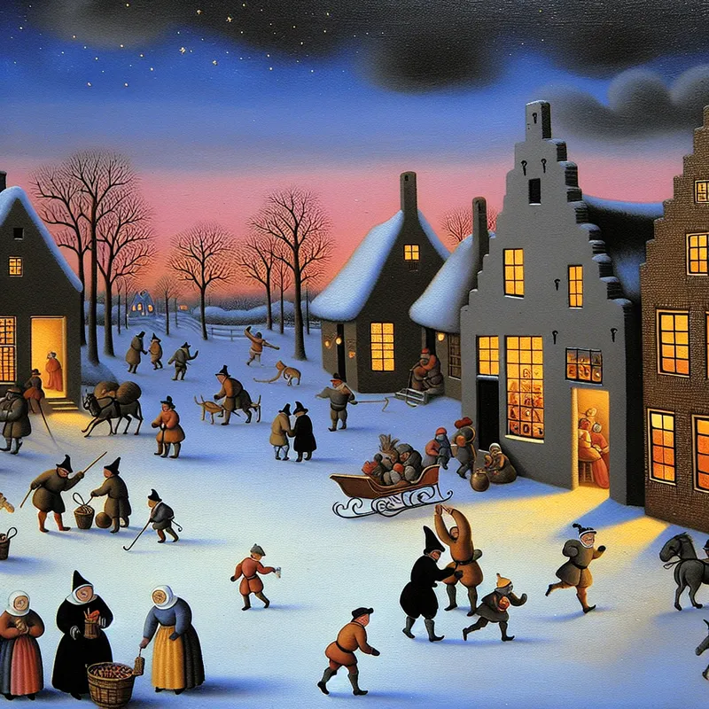 Gezellige winteravond in een Nederlands dorp met mensen die plannen maken voor vanavond, ijsbanen en verlichte huizen in Hendrick Avercamp-stijl