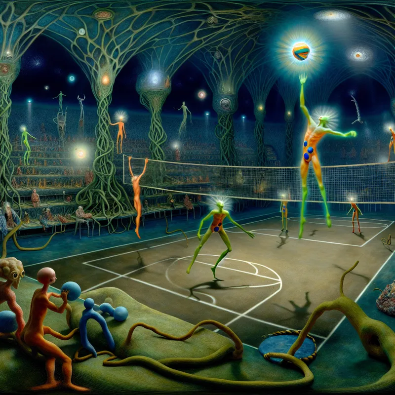 Surrealistisch tafereel van een volleyballwedstrijd in de stijl van Jheronimus Bosch met zwevende elementen en bizarre figuren