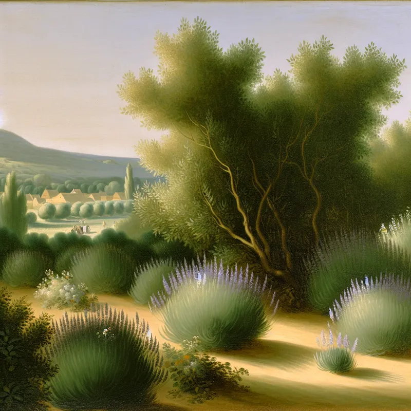Zonnige mediterrane landschap met weelderige lavendelvelden in de stijl van Vermeer, ter illustratie van natuurlijke gebeurtenissen en voorkomen in Zuid-Europa