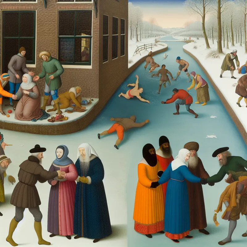 Gedetailleerde wintertafereel van een bevroren kanaal met mensen die afspraken maken en een ongeluk voorkomen, in de stijl van Hendrick Avercamp