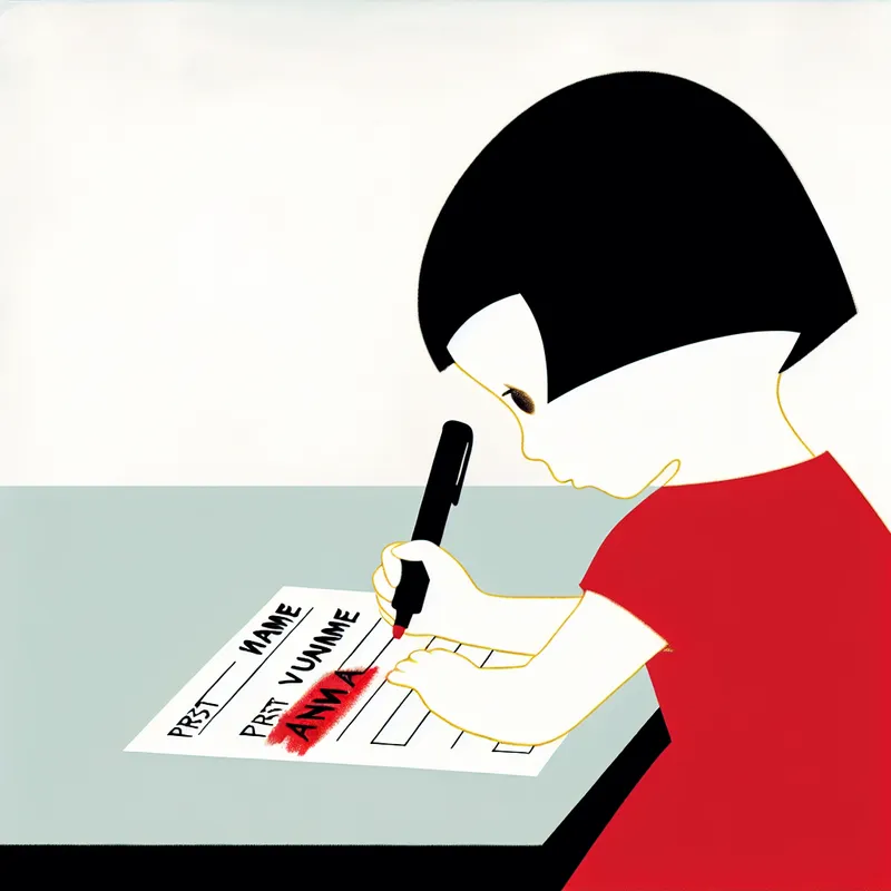 Illustratie van een meisje genaamd Anna die haar voornaam en achternaam invult op een formulier met de labels 'Voornaam' en 'Achternaam'