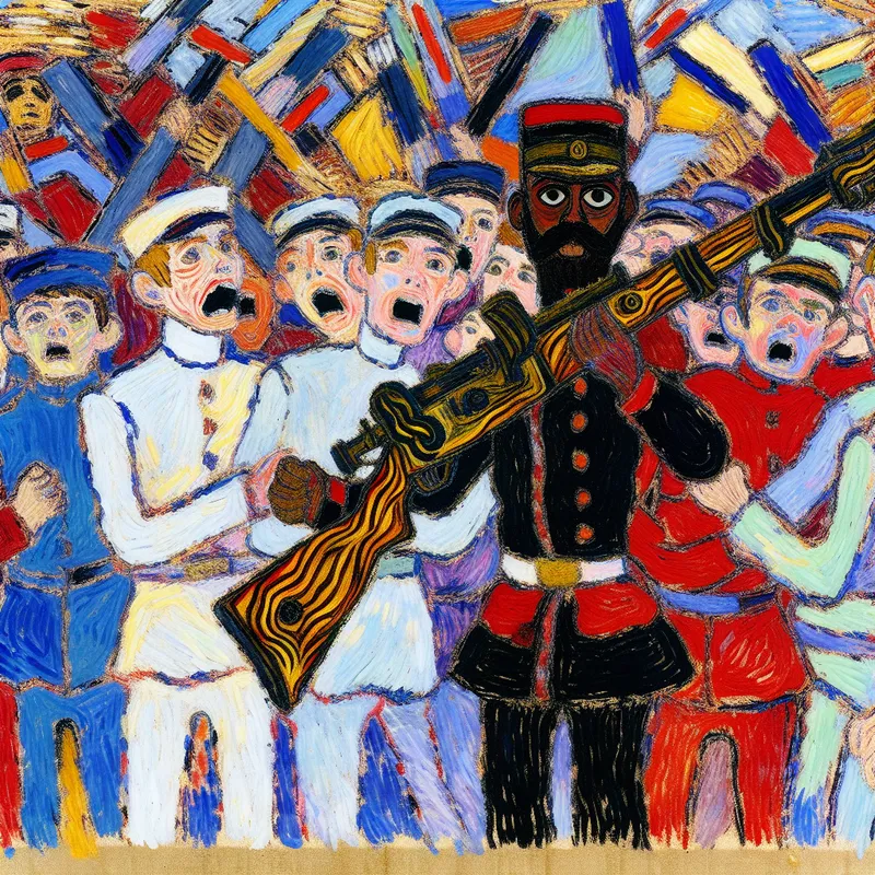 Abstracte voorstelling van een soldaat met een groot geweer tijdens een oefening, geschilderd in expressieve, kleurrijke stijl met dikke penseelstreken
