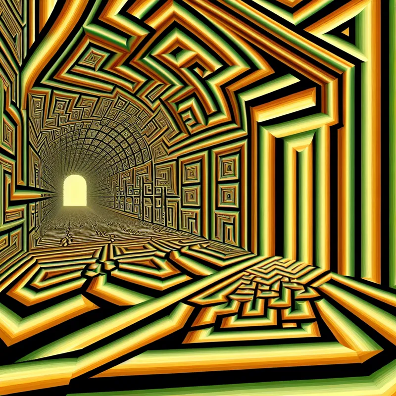 Surrealistisch kunstwerk in de stijl van M.C. Escher met een warme begroeting door een geometrische deur, waarin optische illusies en een uitnodigend pad naar een gezellig huis of land te zien zijn met de tekst 'Welkom thuis, schat!'