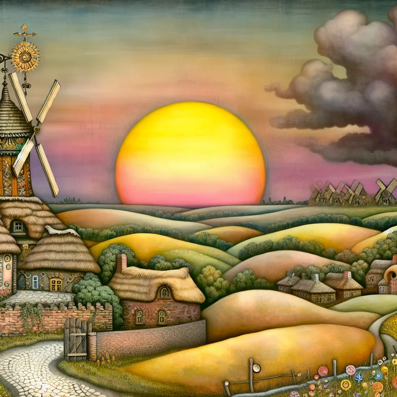 Dorpsgezicht bij zonsondergang met windwijzer die het westen aangeeft, in sprookjesachtige stijl