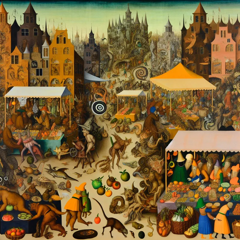 Surrealistische marktscène in de stijl van Jheronimus Bosch met bizarre wezens en levendige handel op zaterdag onder een dromerige hemel