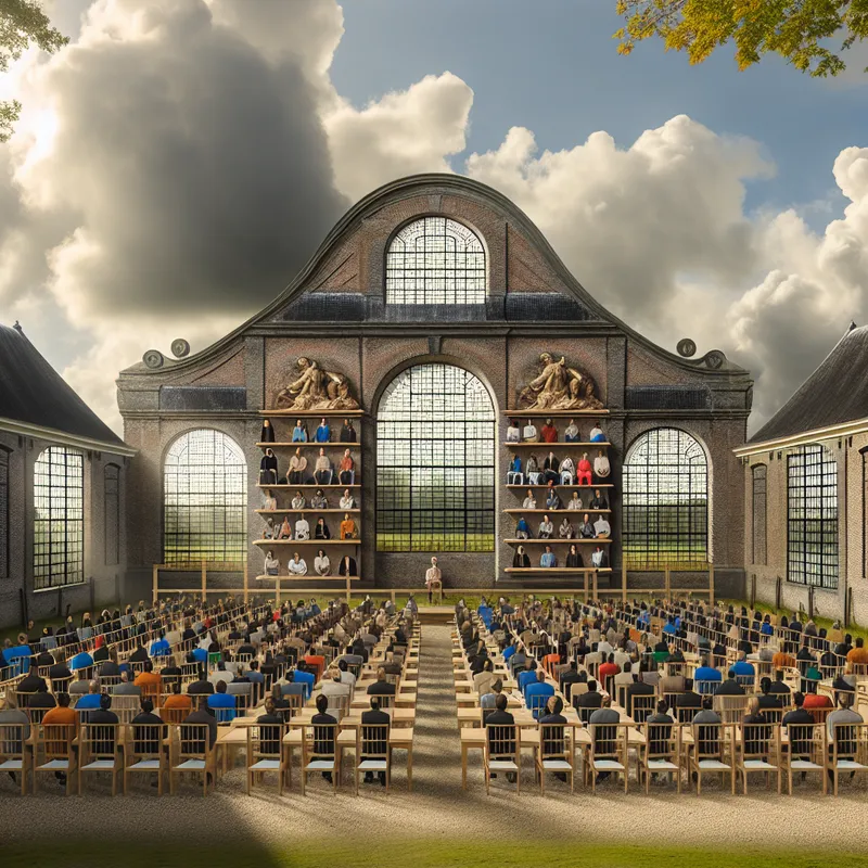17e-eeuwse Nederlandse landschapsschildering van een grote aula met zestig studenten in rijen van tien, zichtbaar door grote boogramen, met dramatisch licht en realistische details