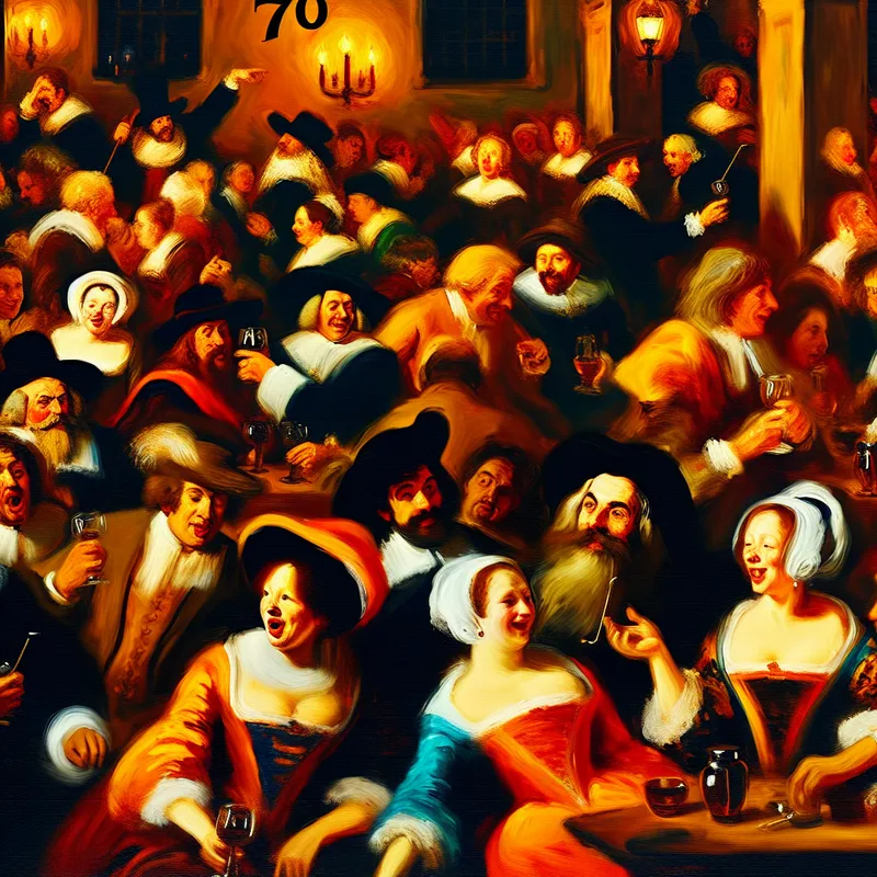 17e-eeuwse Nederlandse banketzaal met zeventig mensen in levendige gesprekken en feestelijke activiteiten, geschilderd in de dynamische stijl van Frans Hals