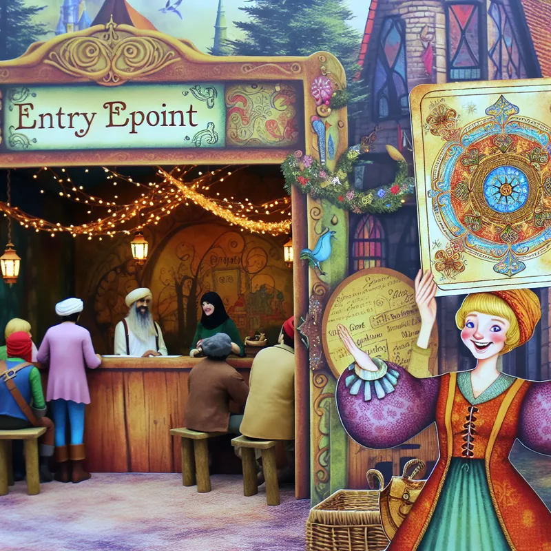 Een vrolijk personage houdt een grote kaart omhoog bij een betoverende toegangspoort van een conferentie, met vintage decoraties en een verwelkomende poortwachter.