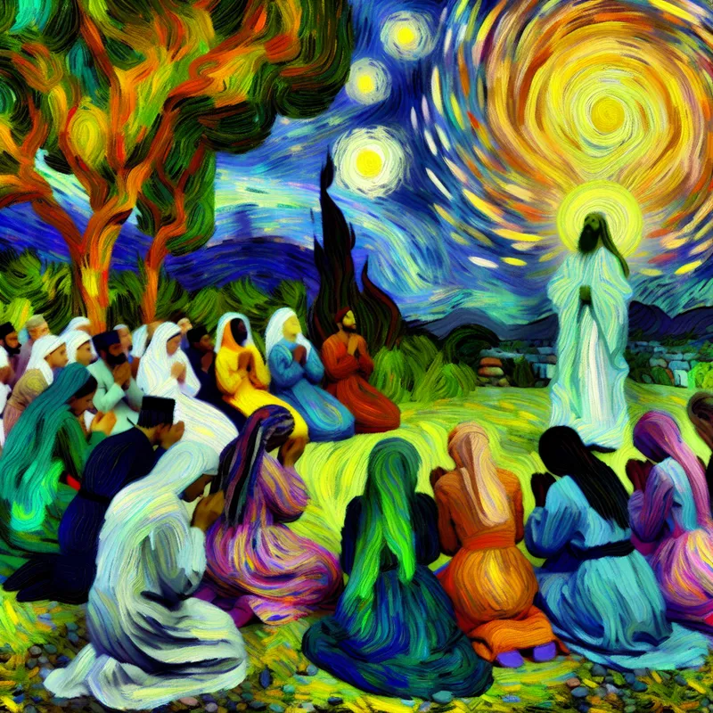 Groep diverse mensen in traditionele kleding, knielend en biddend in een weelderig landschap onder een kleurrijke lucht, met een abstract figuur dat God symboliseert.
