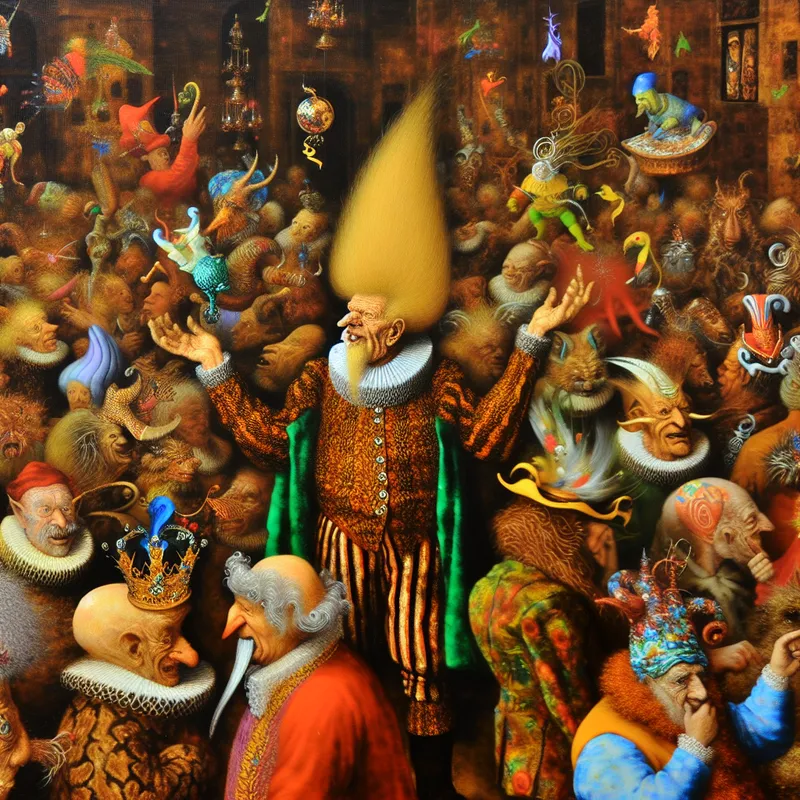 Een flamboyante persoon met een excentriek kapsel in een surrealistische feestsetting omringd door bizarre wezens.