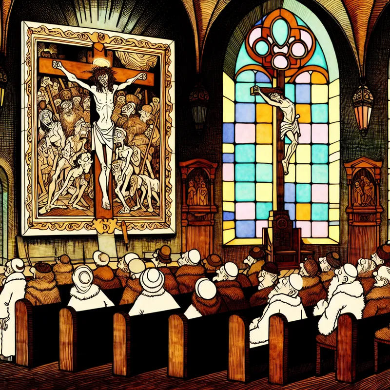 In de kerk hing een groot schilderij van Jezus aan het kruis.