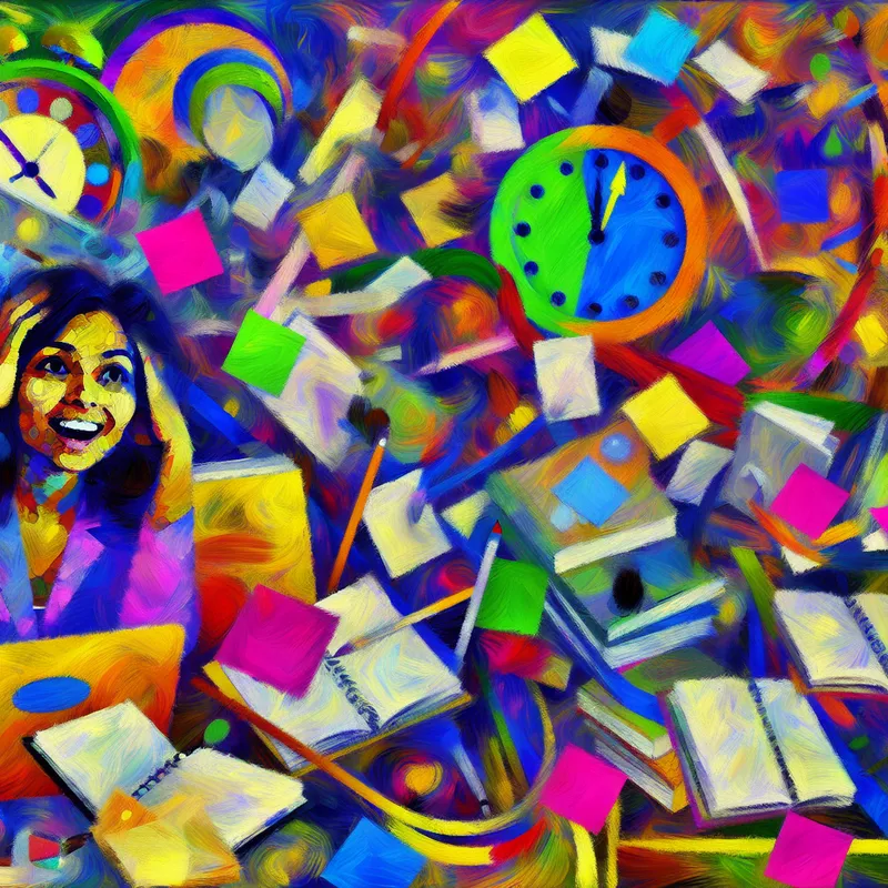 Een kleurrijke abstracte compositie van een persoon omringd door planners, notitieboekjes en sticky notes, zichtbaar gefrustreerd maar speels, in een chaotische omgeving.