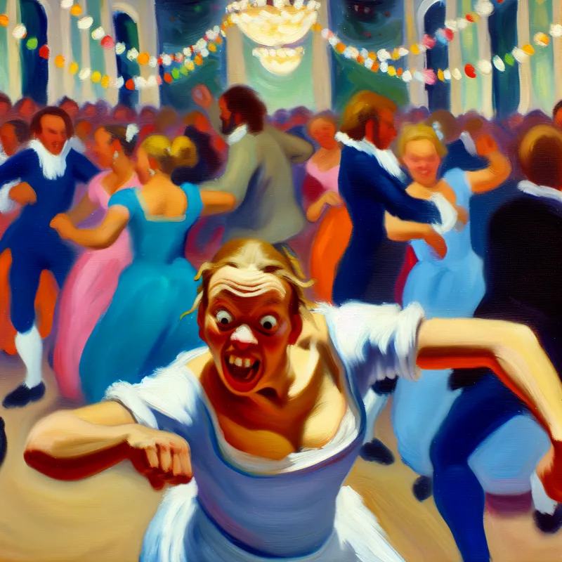 Vrolijke dansende persoon die speelse en onhandige bewegingen maakt op een drukke dansvloer.