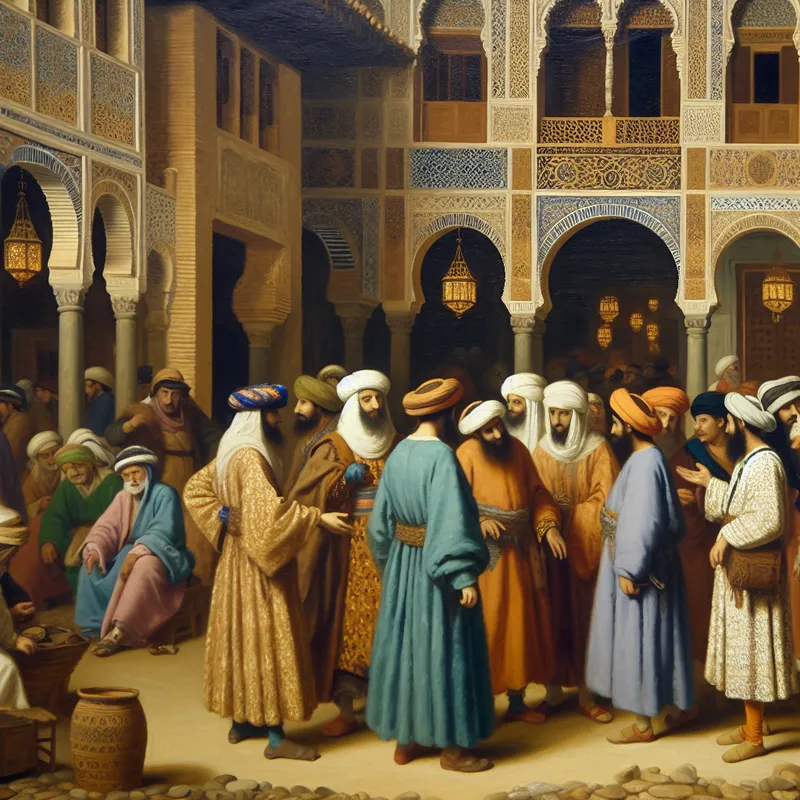 Een levendig beeld van een historische Spaanse markt met mensen van Noord-Afrikaanse of Arabische afkomst in traditionele kleding, die interageren met lokale Spanjaarden, met Moorse architectuur op de achtergrond.