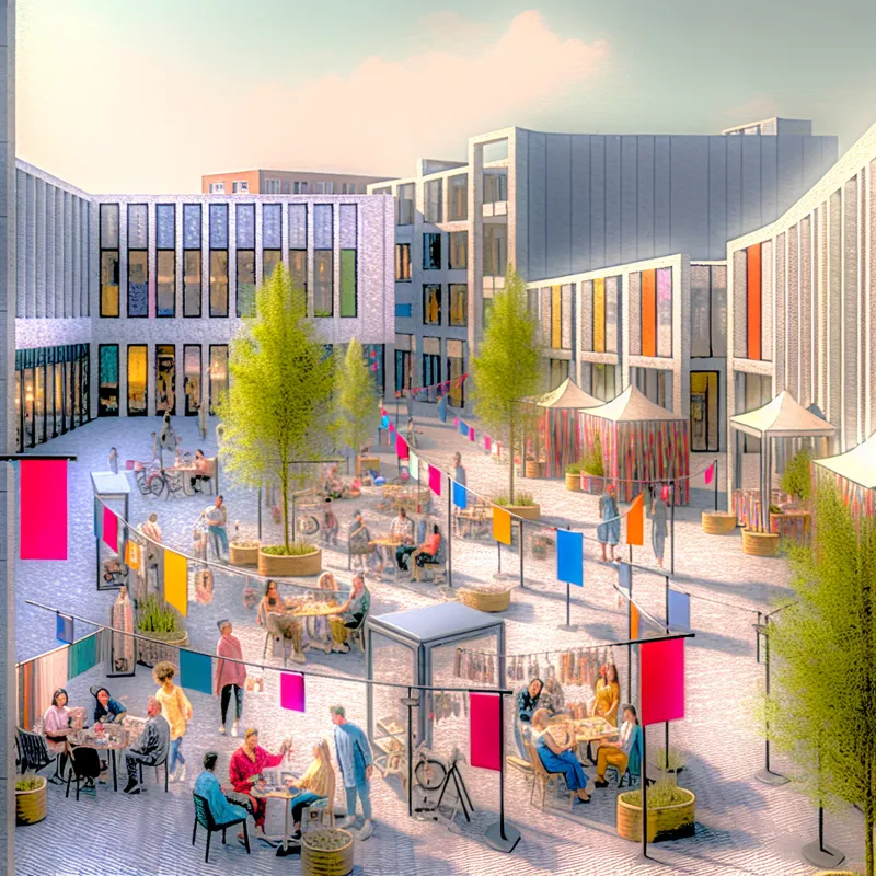 Vibrante buitenruimte van een innovatieve hub met samenwerkende startups en kunstenaars.