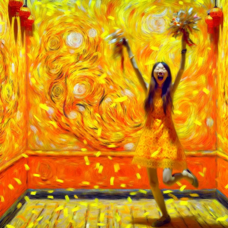 Vrolijke scène in een kamer met een fel oranje muur, een persoon viert met confetti.