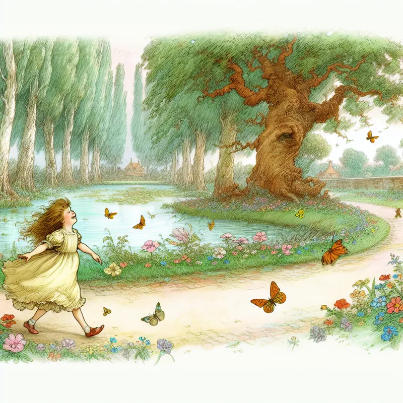 Een jong meisje wandelt vrolijk langs een bloemenpad in een vintage park, omringd door oude bomen.