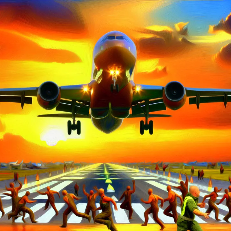 Een groot vliegtuig dat zachtjes naar de landingsbaan nadert tegen een kleurenrijke zonsondergang.