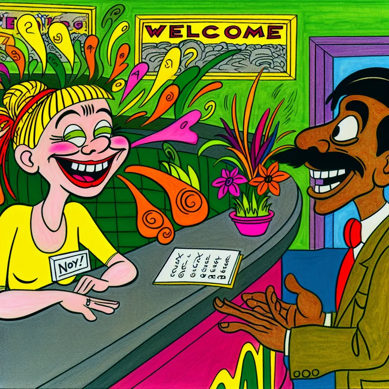 Een vrolijke vrouw deelt enthousiast haar naam met een vriendelijke receptioniste aan de receptiebalie in een kleurrijke omgeving.