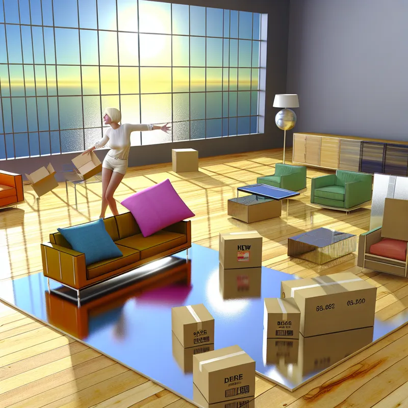 Een vrouw unboxt moderne meubels in een retro-futuristische woonkamer, omringd door dozen.