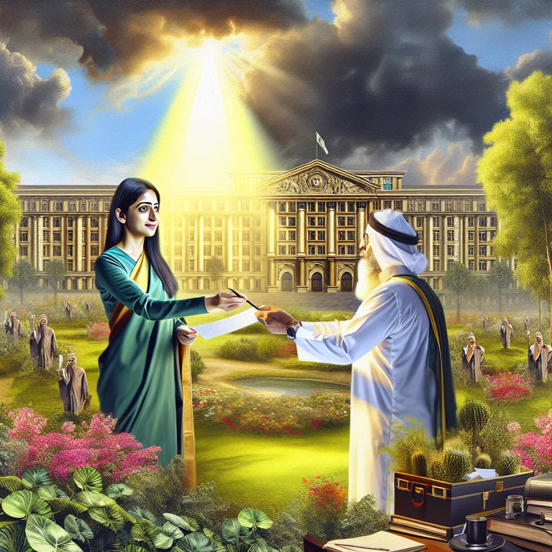 Een vrouwelijke figuur ontvangt ceremonieel een document van een directeur voor haar aanstelling als teamleider, met een indrukwekkend kantoorpand en groene omgeving op de achtergrond.
