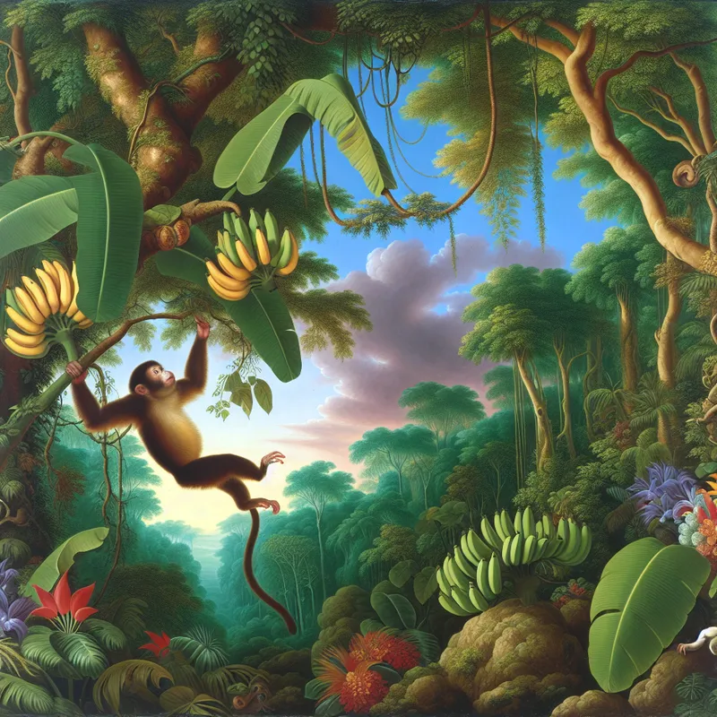 Speelse aap die aan takken slingert in een levendige jungle vol groen en kleurrijke bloemen.