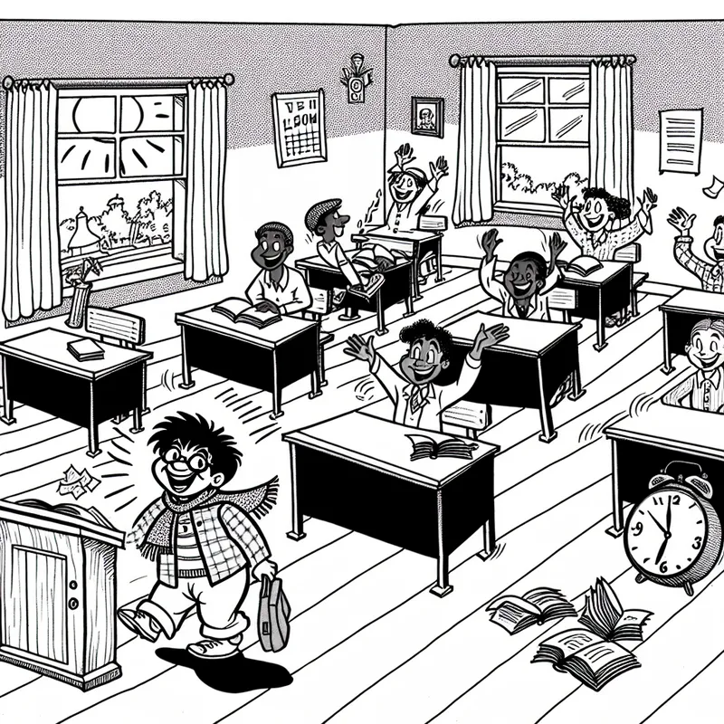 Cartoon scène met studenten die oude gewoontes loslaten in een klaslokaal, met een vrolijke student die op tijd arriveert.