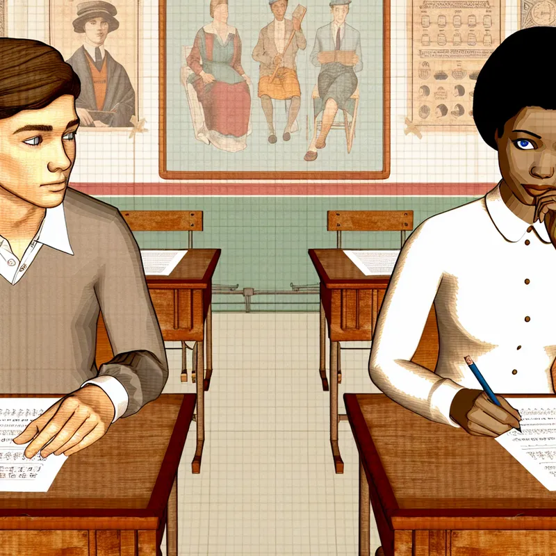 Twee studenten tijdens een toets in een klaslokaal, waarbij de eerste student gespannen naar het werk van de tweede student kijkt
